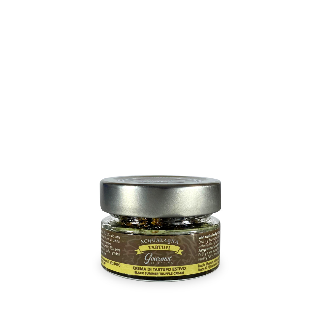 La truffe noire d’été dans toute sa pureté, la crème est faite uniquement avec la truffe noire d’été broyant finement (également appelé scorzone), l’huile d’olive extra vierge et le sel selon la tradition. C’est un produit pur, sans ajout d’arômes ou de conservateurs. La crème de truffe d’été est également un excellent assaisonnement pour nos pâtes à la truffe: riz , polenta, strangozzi, nouilles. Il peut également être utilisé avec de l’huile de truffe blanche ou avec du beurre frais à la truffe. Vous aurez un premier qui ne vous décevra pas. Idéal aussi sur les croûtons chauds.